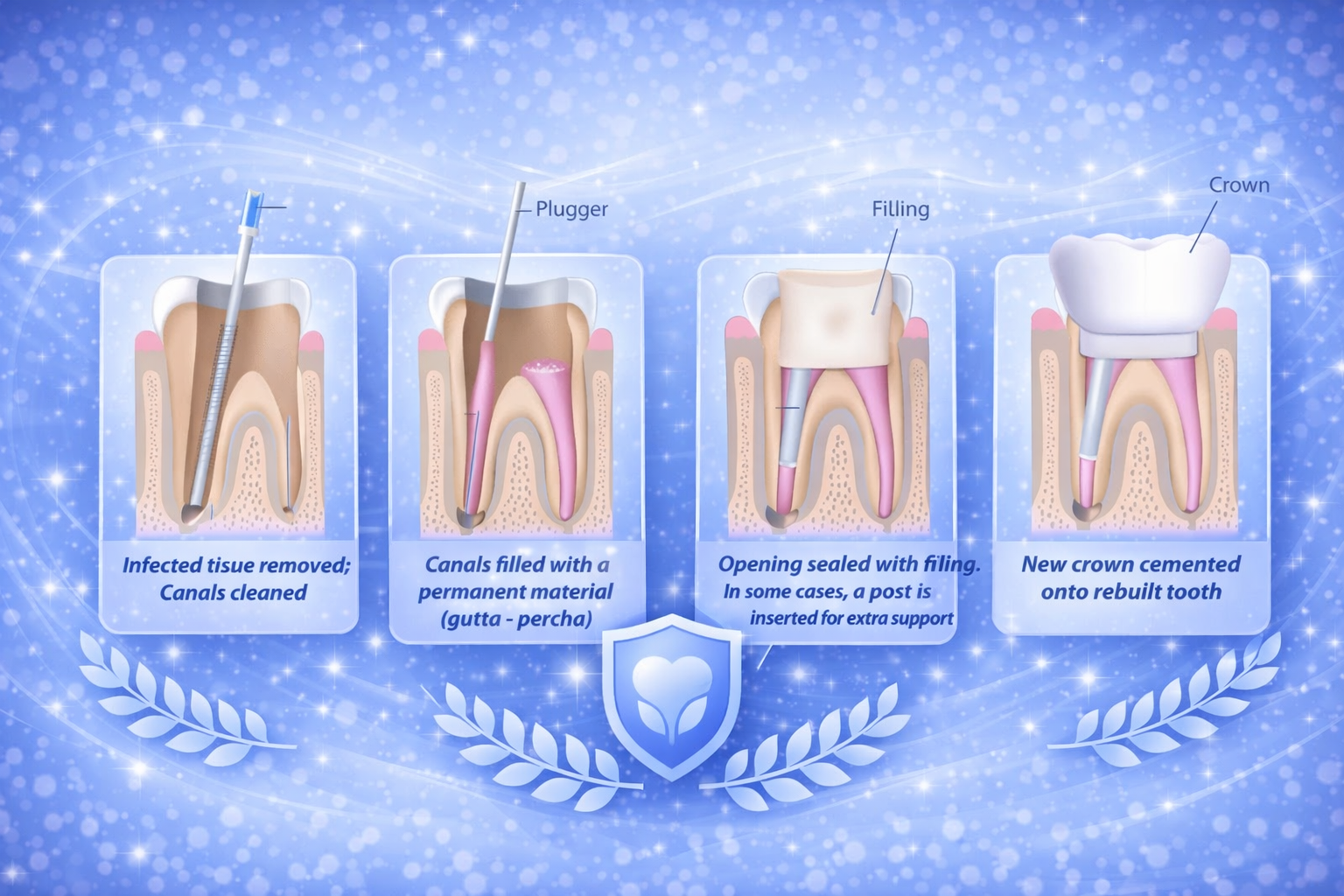 إزالة اللب وتنظيفه: تتم إزالة اللب المصاب أو التالف بعناية من السن، ويتم تنظيف وتطهير قنوات الجذر للقضاء على البكتيريا ومنع المزيد من العدوى.